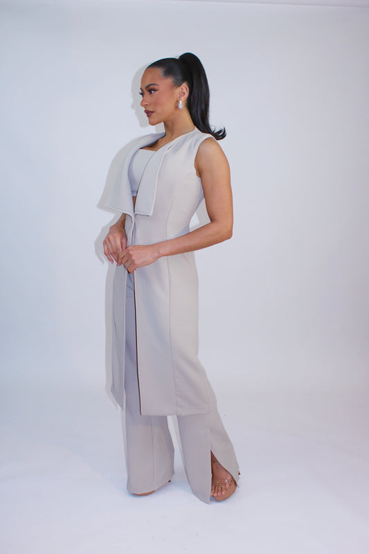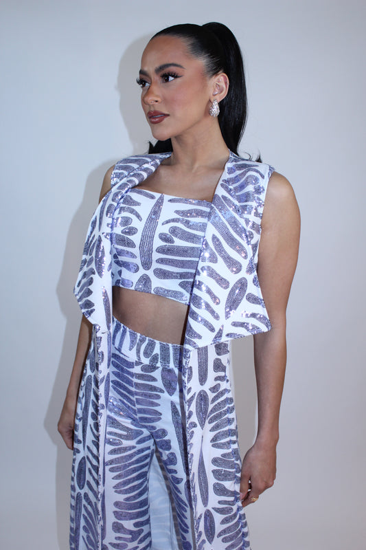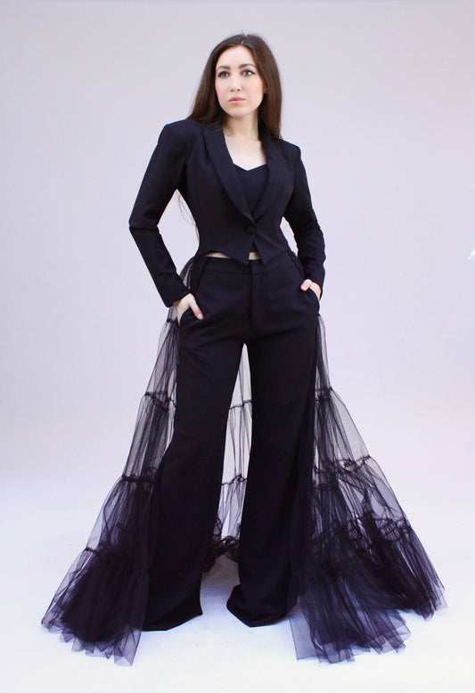 • Tulle trim crop jacket and high waisted pants two-piece suit set