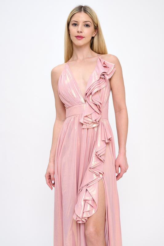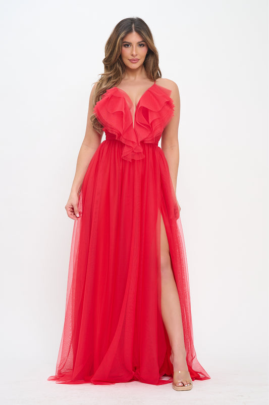 • Spaghetti strap soft tulle ruffle front maxi dress