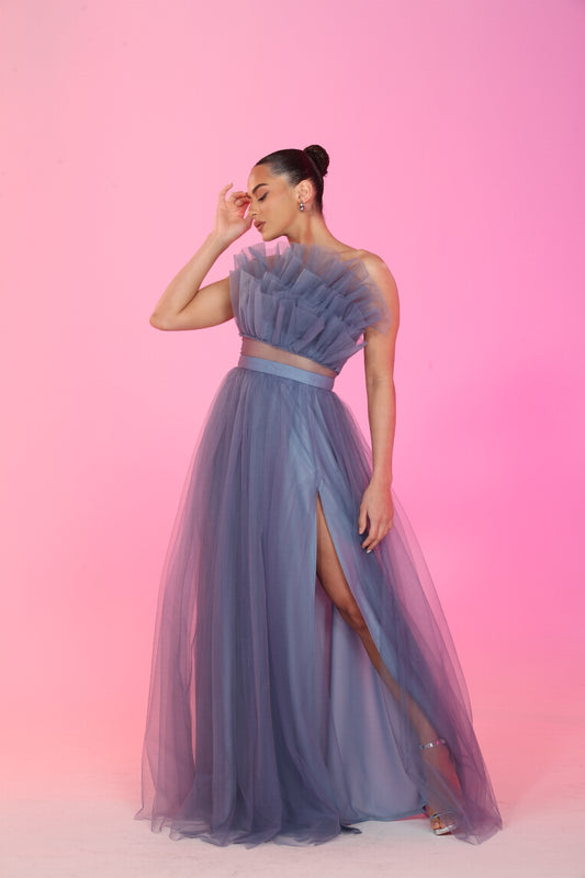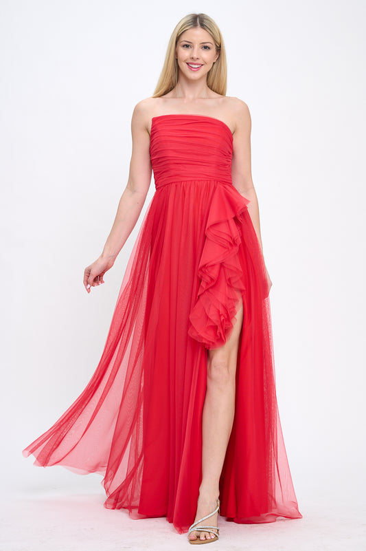 • Strapless layered tulle asymmetrical bodice side slit gown