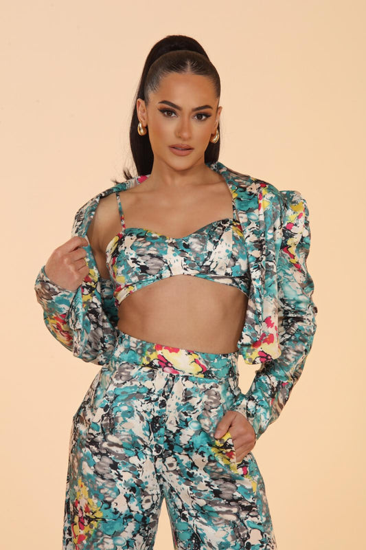 Cara tropical flower print kimono satin cape top with matching high waisted pants set