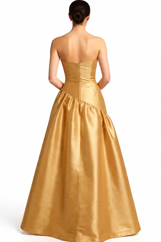 Strapless taffeta asymmetrical back detail gown