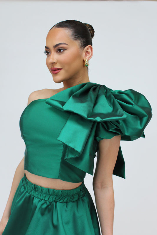Run the party taffeta bow crop top and bubble hem skirt set