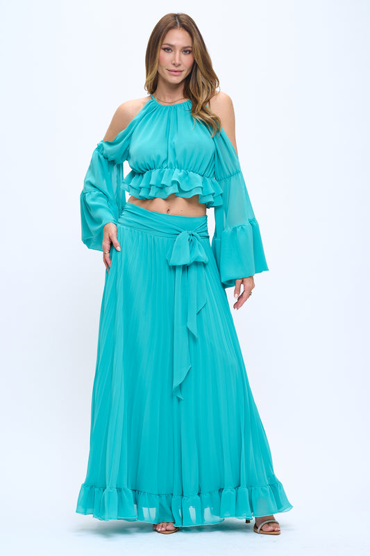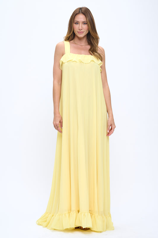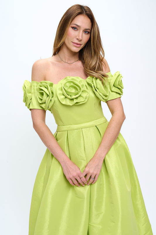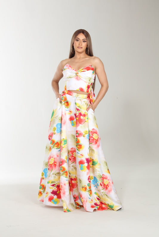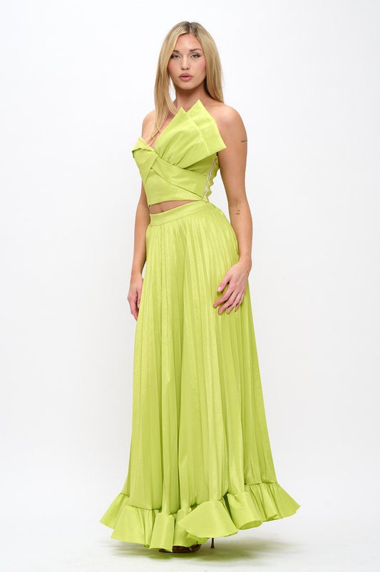 Strapless slit back dress and detachable belted oversized bow ruffle layered train