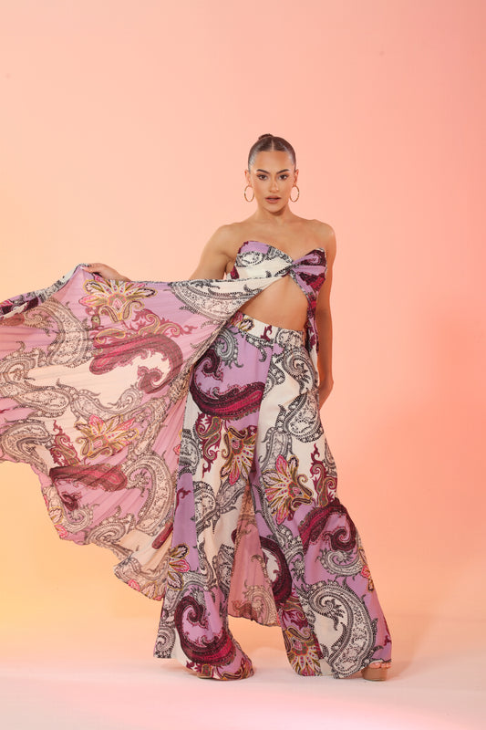 Celeste chiffon paisley pleated split front top and high waisted pants with pockets set