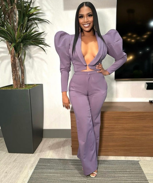Diva Pursuit two-piece puff sleeve crop jacket and high waisted wide leg pants suit set