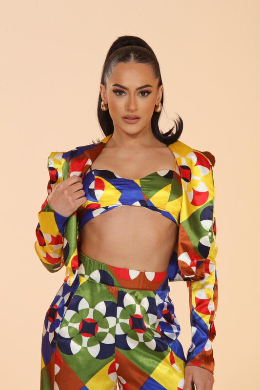 Geo suits you perfectly print satin geometric suit set with pockets