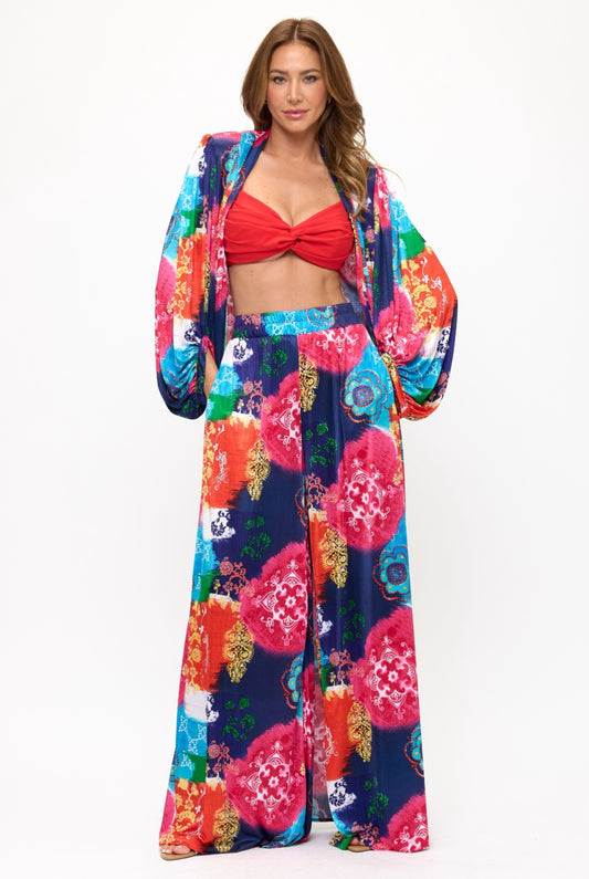 Floral kimono wrap top and high waisted pants set