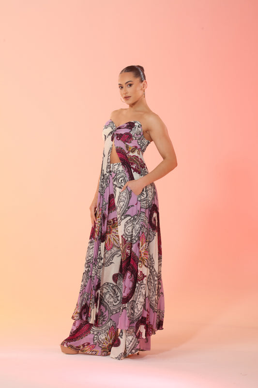 Celeste chiffon paisley pleated split front top and high waisted pants with pockets set