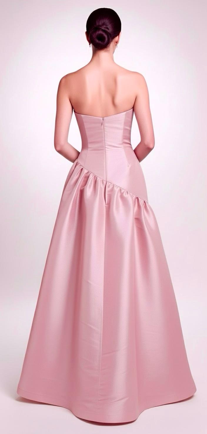 Elevate your formal attire with this unique style. Crafted from luxurious taffeta and featuring a unique asymmetrical back design, this gown exudes elegance and sophistication. Make a statement at any event with this show-stopping piece.
