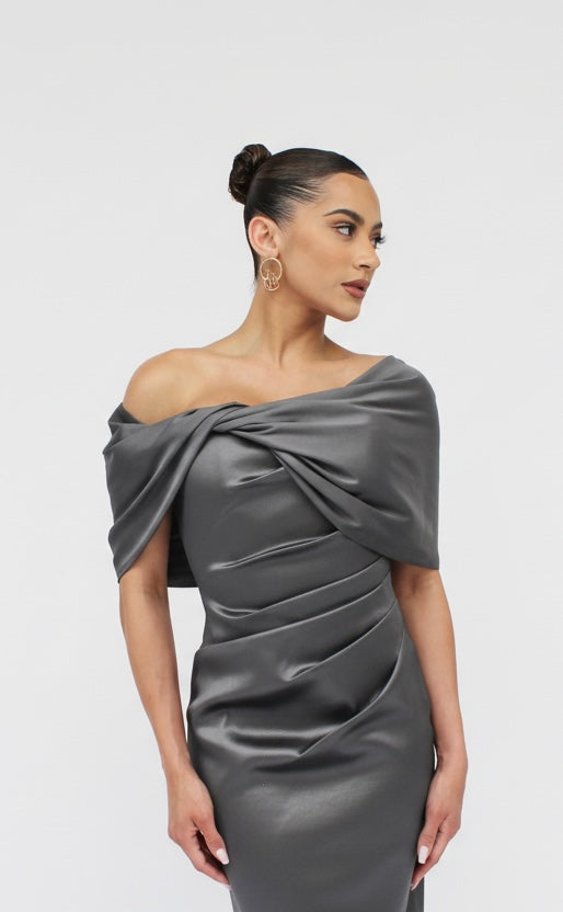 Taffeta twist tea length off shoulder gathered midi back slit dress